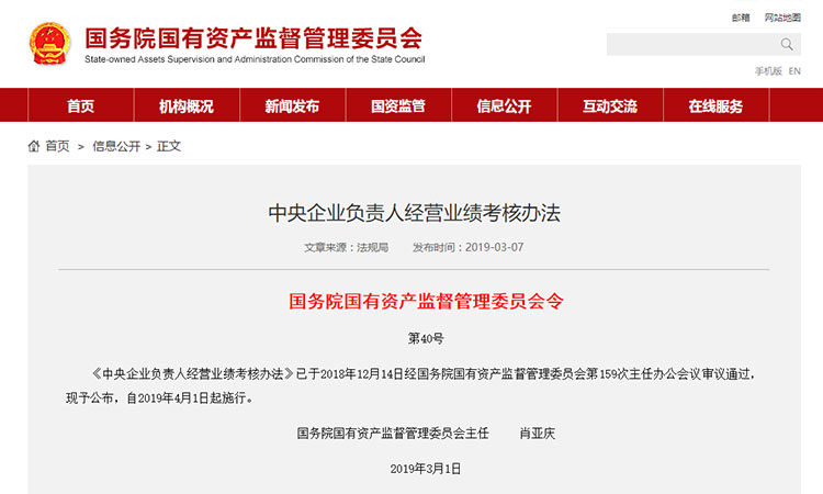 《中央企業(yè)負責(zé)人經(jīng)營業(yè)績考核辦法》已于2018年12月14日經(jīng)國務(wù)院國有資產(chǎn)監(jiān)督管理委員會第159次主任辦公會議審議通過,現(xiàn)予公布,自2019年4月1日起施行。